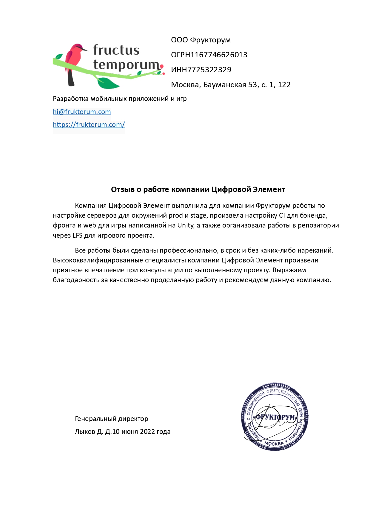Компания Цифровой Элемент выполнила для компании Фрукторум работы по настройке серверов для окружений prod и stage, произвела настройку CI для бэкенда, фронта и web для игры написанной на Unity, а также организовала работы в репозитории через LFS для игрового проекта. Все работы были сделаны профессионально, в срок и без каких-либо нареканий. Выражаем