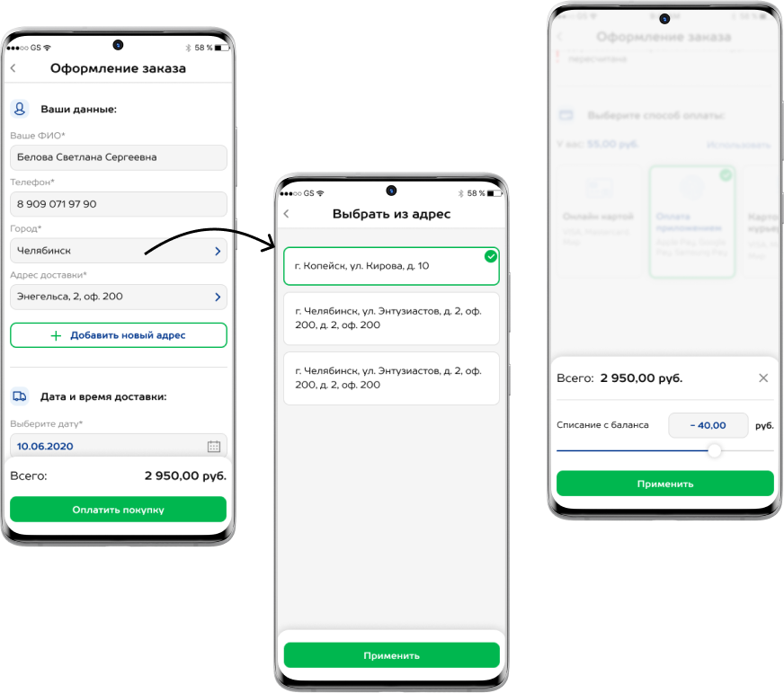 • Выбор способа оплаты (онлайн картой, оплата приложением через Applypay или GooglePay, курьеруом банковской картой, курьеру наличными или по счету на оплату).