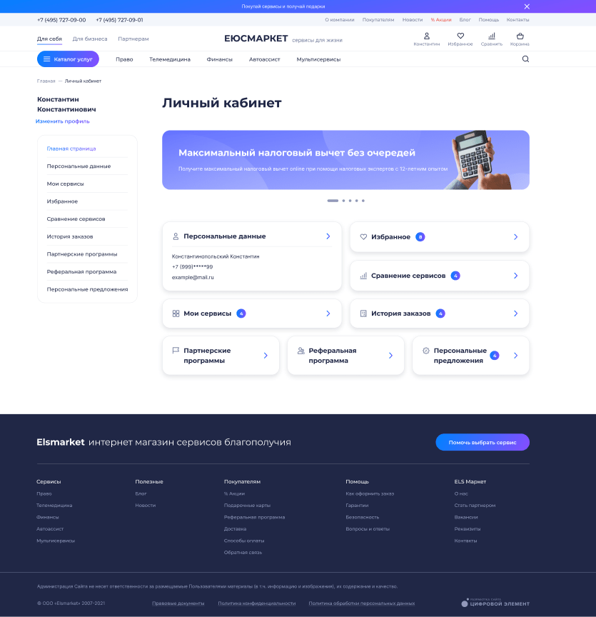 Маркетплейс визуально состоит из трех версий для юридических, физических лиц и партнеров с возможностью переключения версий в шапке сайте и сохранению этого переключения при просмотре других страниц сайта.